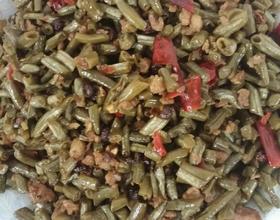 4,放入切好的酸豆角倒入锅里放入小勺盐小火慢炒,这样可以把炒出的肉汁收进豆角里面。