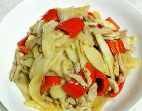 炒得差不多的时候,放红椒翻炒,炒得红椒断生