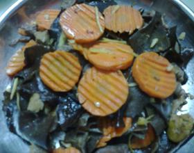 起油锅,将红萝卜和木耳一起爆炒5分钟,盖上锅盖3分钟。