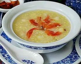 取烧锅,放适量清水,放入莲子放入糯米与小米