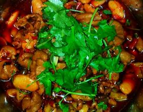 下大豆(或者其他食材,萝卜,豆子之类),加辣椒油,加水没过,加料酒,盐,待豆子烧烂,加鸡精,装盘,撒上香菜既可