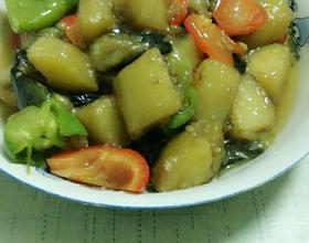 待水快干时尝下味儿淡了就加点盐。放入青红椒块,勾薄芡翻炒几下就可以出锅了。