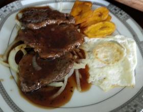 用平底锅把牛肉两面煎至八成熟,鸡蛋煎熟,洋葱炒一下垫盘底,香蕉切片油炸摆边,牛排放在上面。