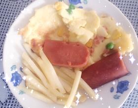鸡蛋饼盛盘中,剩于有油多的用来煎火腿肠