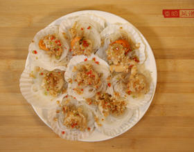 - 12. 锅内下20克色拉油,大火烧至7成热,用热油淋在青红椒和蒜沫汆一下;最后淋豉油10克即可,一道美味可口,色香味俱全的粉丝蒸扇贝就展现在大家面前了。