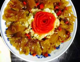 猪皮冻切片,花椰菜泡盐水,水开放一点有一点盐,汆花椰菜,熟后入冷水,捞起,摆在盘中间