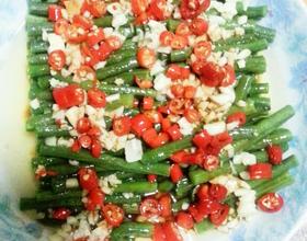 将切好的豇豆,用热水焯5分钟左右,在水里滴1-2滴油,会使豇豆颜色鲜绿。