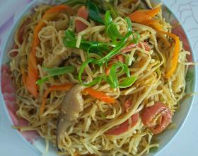 - 5. 锅盖盖上用小火炒五分钟,盛出时放点葱丝在面条上就可以开吃了