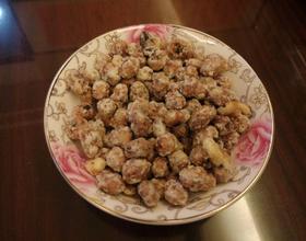 倒入以炒好的花生米快速翻炒,使每颗花生米都裹上糖浆。