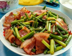 放入油,油热后放姜丝煸炒。放入培根,煎熟。