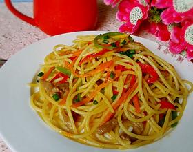 - 7. 翻炒直胡萝卜丝,青红辣椒丝,洋葱丝变软后,加入意面继续翻炒两分钟左右