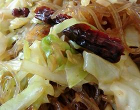 然后放入包菜,翻炒几下,再放入粉丝,继续翻炒,放入酱油和十三香,翻炒,最后放入盐,稍微炒一会