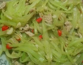 肉切好用生粉和酱油抓下,放油,把肉先炒下捞出备用,然后放油,倒莴笋炒,放辣椒和蒜,炒1分钟放肉进去炒,炒一下就放盐,翻炒1分钟,放入鸡粉翻炒下就可以出锅了,