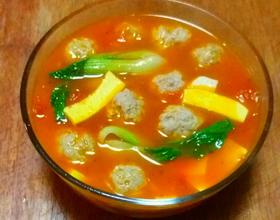 - 7. 加入养熟肉丸及原汤,放入适量的盐调味,放入黄、白蛋糕片、菜心略烫出锅。
