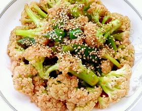 菜花掰小朵放盐水里浸泡半个小时,清洗干净,控水(我买的有机菜花,味道比普通菜花好吃)