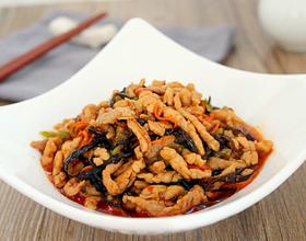 再倒入青椒、木耳、胡萝卜丝翻炒均匀,用刚才装酱汁的小碗装点水加进去,大火炒至酱汁浓稠即可。