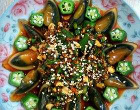 把调好的料汁浇在皮蛋和秋葵上,最后加点香油洒上芝麻即可。