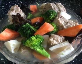 锅中加入清水,加入排骨,放入大料,葱,姜,料酒炖至8成熟,放入盐和蔬菜。