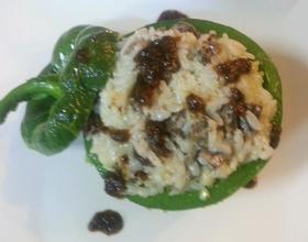我放油。把所有的料切成小丁放圆葱炒香。放米饭。食用盐。,黑胡椒。沙拉酱。炒香后。装入青椒里。上放奶酪。