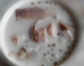 把刚才的芋头和西米混合,加入椰汁,稍微加热一下,不用煮开,喜欢甜的可以加点糖