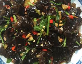 把锅烧热倒入植物油,把烧热的油倒入放香菜,蒜蓉,辣椒的碗里面,加入调料拌一下,再倒入木耳,搅拌一下即可食用