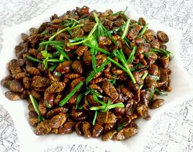 蚕蛹洗净 ,放锅里加水没过蚕蛹,把姜片,葱段,一勺盐,花椒八角放入 ,开锅煮五六分钟捞出,把葱姜挑出来,控水备用。
