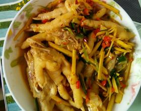 鸡爪炖好切成两半之后,再在锅里放点油,再把切好的姜跟辣椒放下去。最后再把鸡爪放下去一起炒。感觉炒熟了就可以装盘了。