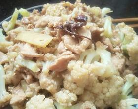 开火锅里放少许油,五六成热时把葱、姜、辣椒、八角依次放入锅里煸香再放淹好的肉片,炒到肉片变色放进花菜炒片刻,放入一点点冷白开炒熟就好了。