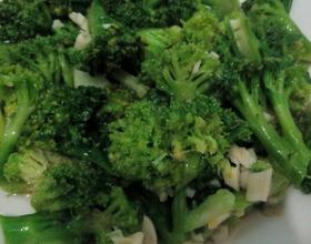 倒入西兰花 翻炒几分钟 加入盐 味精 鸡精 翻炒加入剩余的蒜末 翻炒出锅