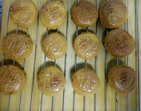 - 4. 月饼模具拍上面粉,将月饼胚放入模具中按实,压成饼。