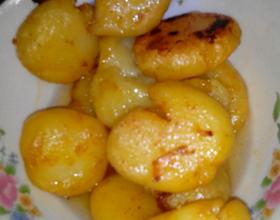 锅里倒入油把蒜蓉放入锅里翻炒一下在把土豆一个一个的放到锅里用小火慢慢的煎。
