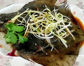 锅中添水烧开后放入多宝鱼蒸十分钟左右,把葱姜挑出去掉,倒掉盘中汤汁。