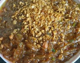 加水,待汤汁辣椒面,花椒面,鸡精,白糖煮开,下粉丝,待汤汁将干时撒入蒜苗碎,抄匀起锅。
