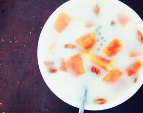把煮好的椰汁木瓜倒入碗里再加入西米