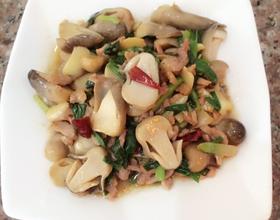 锅下热油少许,放入蒜片煸香,(喜欢辣的可以加入辣椒煸炒)加入腌制的肉丝略炒,放入葱白,加入汆烫过的草菇,翻炒,加盐、糖、鸡精少许。