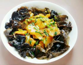 泡发的黑木耳用清水洗干净,去芥蒂,撕成朵。不用完全沥干水。