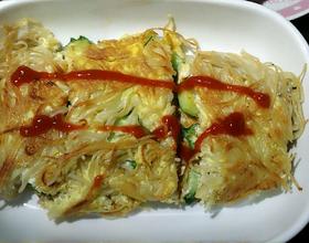倒入蛋液,放入黄瓜片,翻面煎2分钟,再翻面,抹辣酱,对折,切段