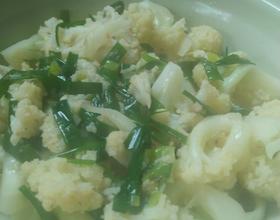 放盐.葱叶.料酒炒几下,加一点点水(怕花菜没熟透)水干加鸡精炒均匀起锅就好