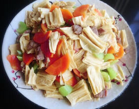 - 6. 翻炒至胡萝卜断生再放入纱芹炒均匀,放入腐竹,倒入酱汁(内有盐,糖,生抽,蚝油,清水,生粉),大火翻炒 入味后,装盘即可