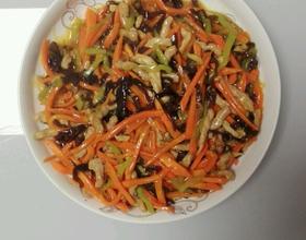 - 6. 少许油炒辣椒末~炒葱姜蒜~加胡萝卜加辣椒木耳翻炒最后加入肉丝