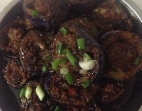肉剁碎后,把茄子捞起,用母指挤压茄子,挤个洞