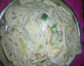 先把莲藕洗净切薄片,五花肉切薄方待用,葱,大蒜切小段