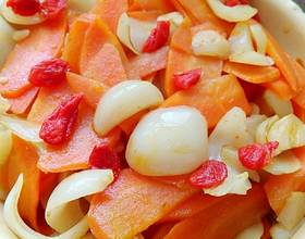 把红萝卜和百合一起倒入翻炒,倒15ml水和一小勺盐焖3分钟