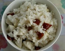 红枣切开后,甜味更容易煮出来,加水时比平时煮白饭稍稍多些。