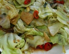 倒菜籽油入锅加热,先放入葱姜蒜辣椒,炒出香味,再放入包菜,随后放入料酒和老抽翻炒,加调味料食盐,淋入香油出锅。