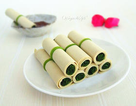 第5步,我这个是卷了两三圈后就切去余下的豆腐皮了,我买的这个豆腐皮刚好一张能卷2个长卷,也就是成品图大小的4个那样的卷。