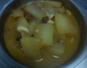 放冬瓜进去翻炒均匀再加水开始炖冬瓜。