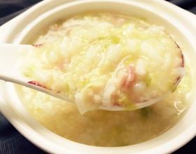 娃娃菜断生后加水,下火腿丁,尽量多加一些,熬的时间越长,粥越好吃;