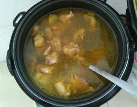 将鸡放入煲内,加姜三片一块煲,板栗放在沸水里煮三分钟后去壳,膜备用