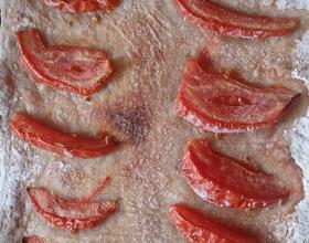 置于烤架上。摆上西红柿片,撒上椒盐。